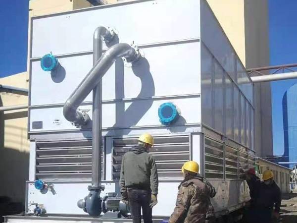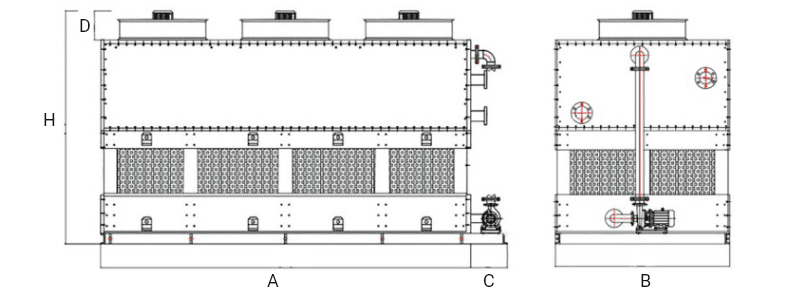 Hot process fluid enters the coil (or tube bundle) from the water intake, and the spray system and fan system are started at the same time. The heat of process fluid undertakes heat transfer via tube walls and is transferred to the spray water running through the outer surface of the tube. The process water becomes cool and then flows out from the water outlet for internal circuit. Driven by the fan, the air outside the unit enters from the air intake, in the opposite direction of water flow, and moves upward through the coil. A small amount of water evaporates and flows through the drift eliminator, collecting the excess moisture into the water tank. Meanwhile, the hot and humid air is dispatched into the atmosphere from the top of the tower. The rest of the water falls into the water tank at the bottom, recycles to the spray system via the water pump, and then returns to the tube bundle.